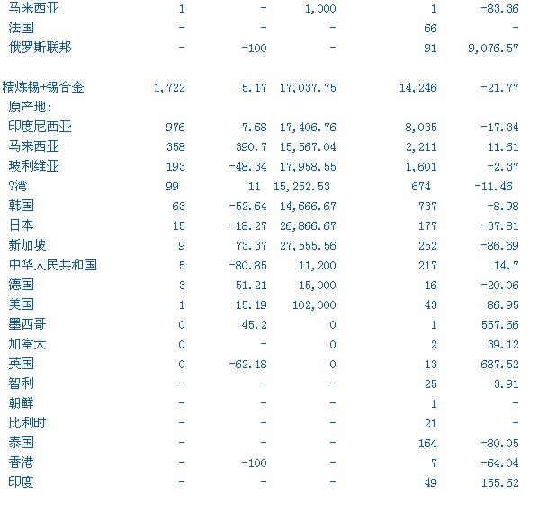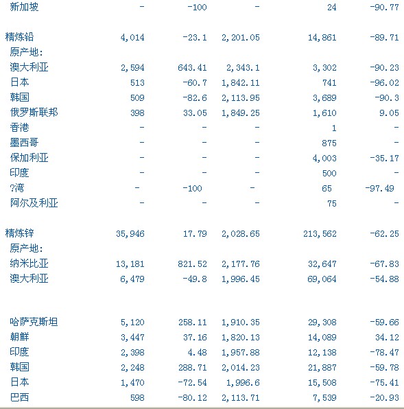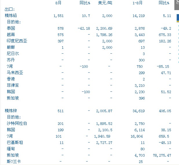 中國(guó)8月精煉鉛、鋅、鎳和錫進(jìn)出口分項(xiàng)數(shù)據(jù)