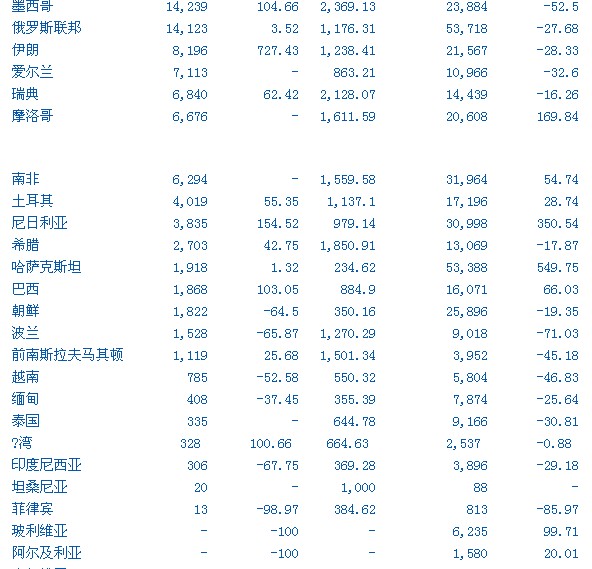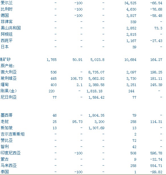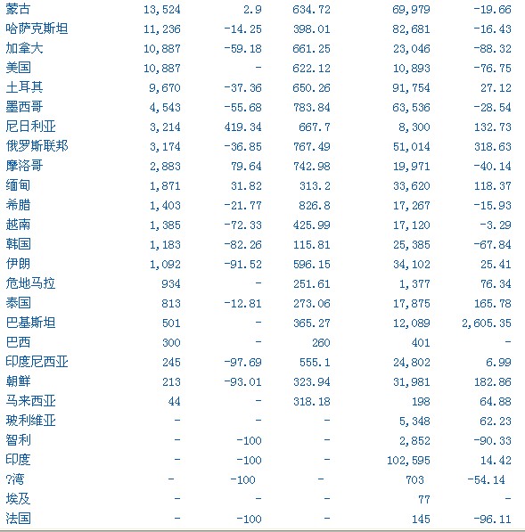 注:價(jià)格數(shù)據(jù)由路透根據(jù)中國(guó)海關(guān)提供的數(shù)量和金額計(jì)算得來(lái). 進(jìn)口數(shù)據(jù)價(jià)格基于CIF到岸價(jià);出口數(shù)據(jù)價(jià)格基于FOB離岸價(jià). -為數(shù)據(jù)無(wú)法提供. 以上信息由HENYEP OVERSEAS LIMITED 發(fā)布