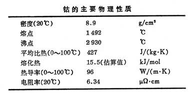 [鈷的主要物理性質(zhì)] 含鈷高溫合金在 900~1000下仍有很高的強(qiáng)度和抗蠕變性能,多用于制作噴氣發(fā)動機(jī)的耐高溫部件。鈷能提高鐵基、鋁鎳基和稀土金屬合金的磁飽和強(qiáng)度和居里點(diǎn),使其具有高矯頑力,是電氣工業(yè)中的優(yōu)良磁性材料。鈷是硬質(zhì)合金的粘合劑。金屬部件用鈷合金涂層和表面硬化后,其機(jī)械性能顯著提高。鈷的氧化物是陶瓷制品的脫色劑和顏料;搪瓷中的含鈷釉料可使搪瓷同鋼更好地粘結(jié)在一起。鈷的有機(jī)化合物在油漆中作催干劑。鈷還在化工生產(chǎn)中用于碳?xì)浠衔锏乃、脫硫、氧化、還原等方面 Co是γ射線源,用于物理、化學(xué)、生物研究和醫(yī)療部門。