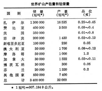 [世界礦山產(chǎn)鈷量和鈷儲量] 中國已探明的鈷儲量最大的是甘肅金川硫化鎳礦中伴生的鈷。云南的硅酸鎳礦以及四川、山東、湖北、山西、廣東等地的黃鐵礦中也含有鈷。